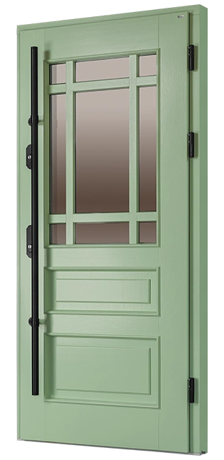 Drzwi wyróżniają się tradycyjnym wzornictwem inspirowanym stolarką z dawnych lat.